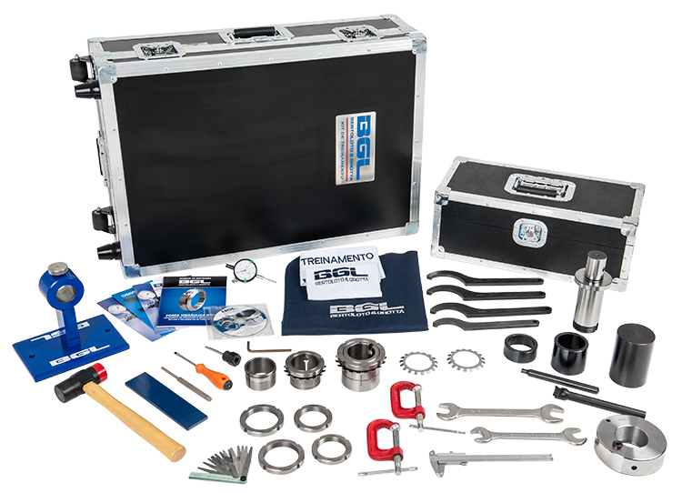 | Além de fabricar uma linha completa de produtos e ferramentas para a montagens e desmontagens de buchas sob rolamentos, a BGL também dispõe de um kit para treinamento dessas operações, para que sejam feitas com técnica e segurança. |